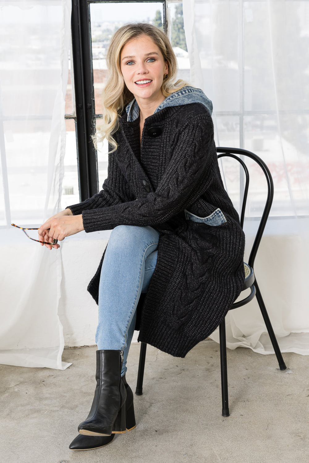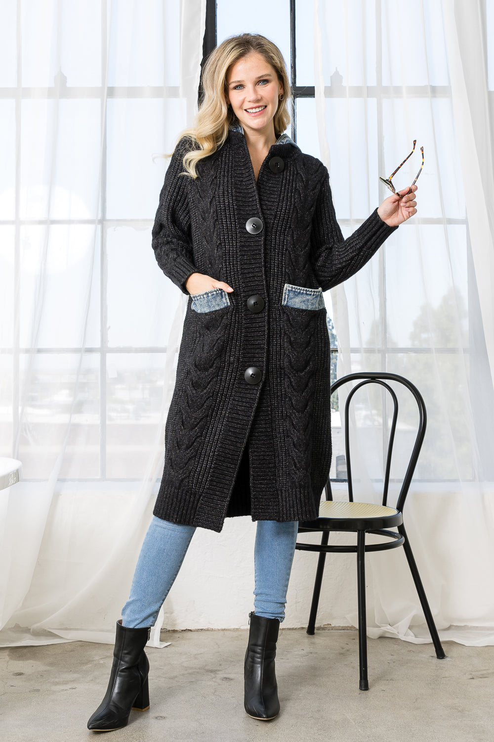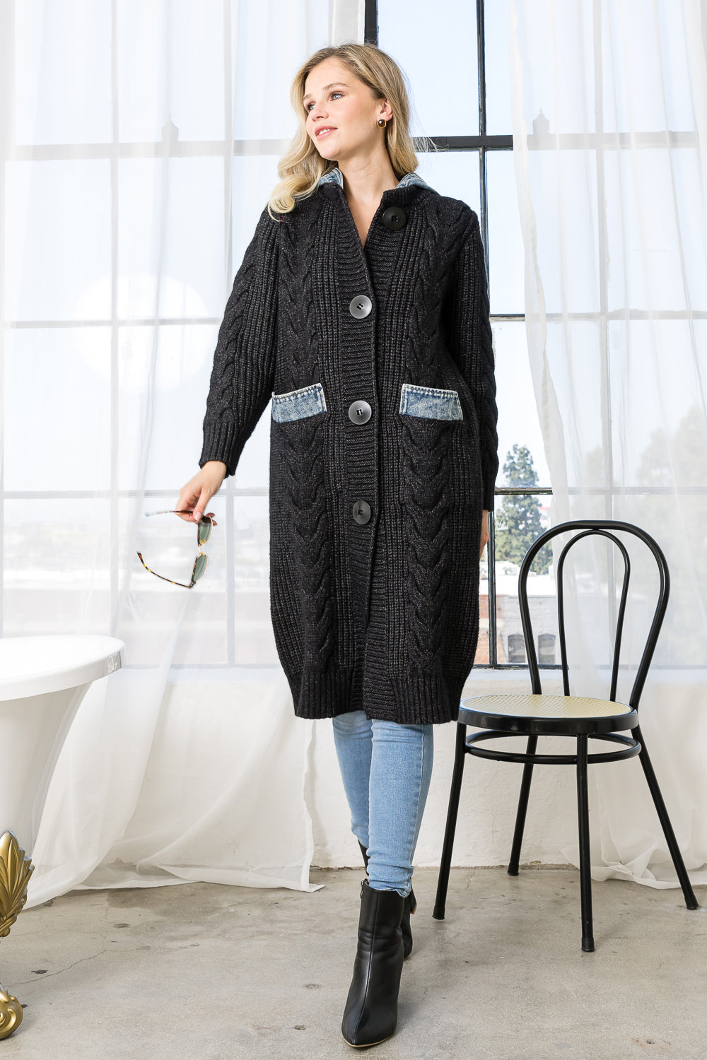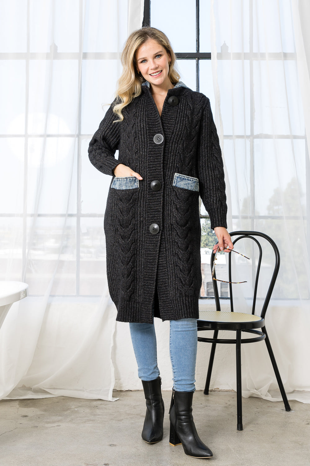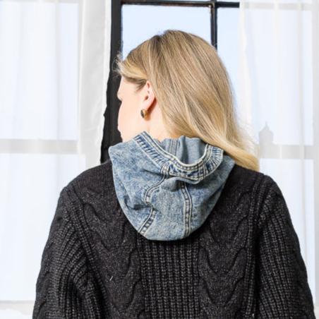 SELINE SWEATER COAT WITH DENIM | GREY VERY DARK